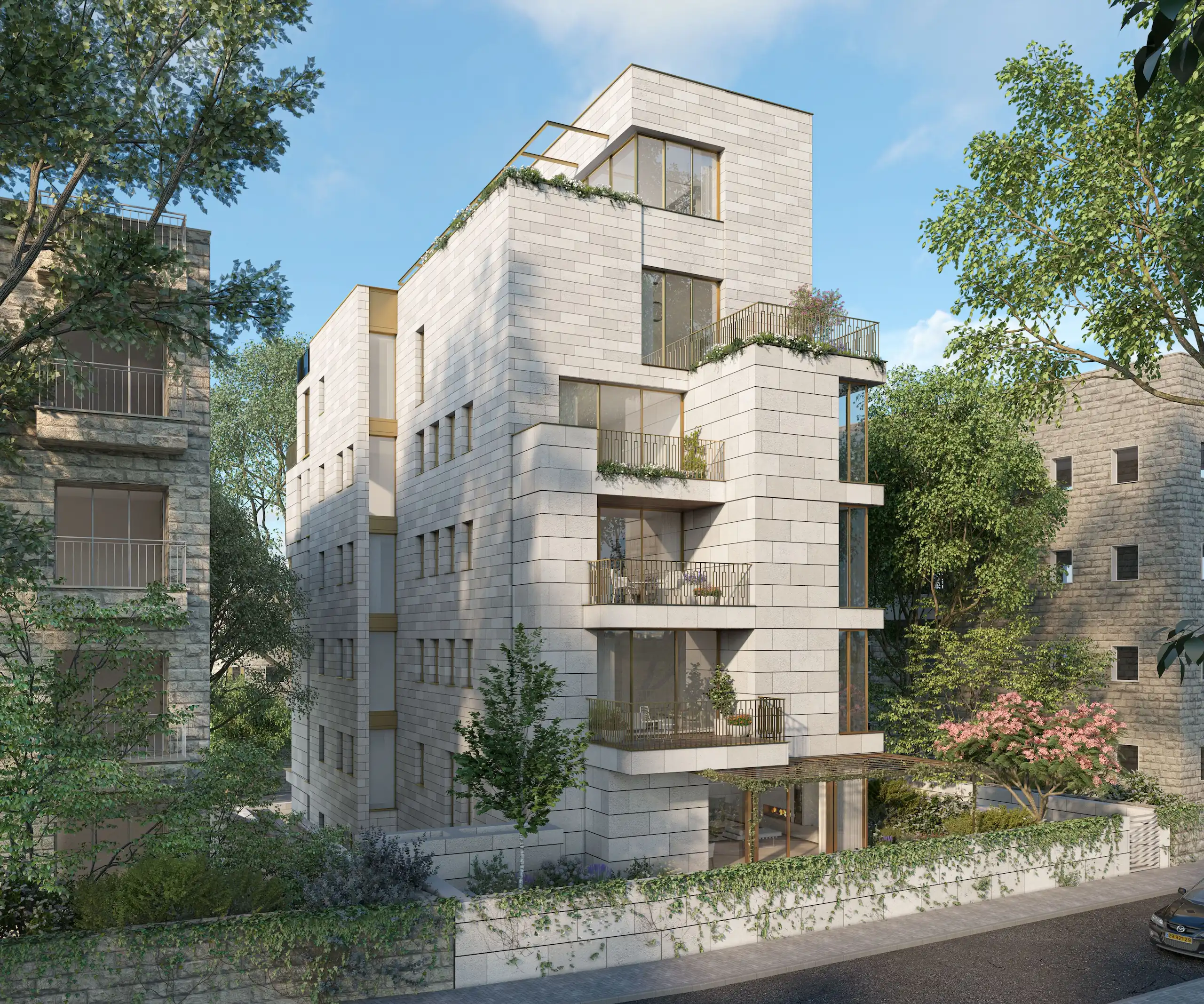 The project is located in the Rehavia Talbiye district of Jerusalem. The building is covered in a modern slick white Jerusalem stone, and the windows and banisters are framed in brass tones. It is homage to the "City of Gold", that my father-in-law, who the building is dedicated to, loved so much. While designing the interior of the building, it was important to me to create apartments that are spacious and have a natural colors pallet with a touch of modern brass. My planning took into consideration the wide windows that allow natural light in, alongside the height of the ceilings and the view. All contributing to my goal of creating a feeling of speciousness in each of the apartments. I used strong, durable and elegant materials, as well as wide planks of floor tiles that will not only whistand the test of time but are easy to maintain and look after.